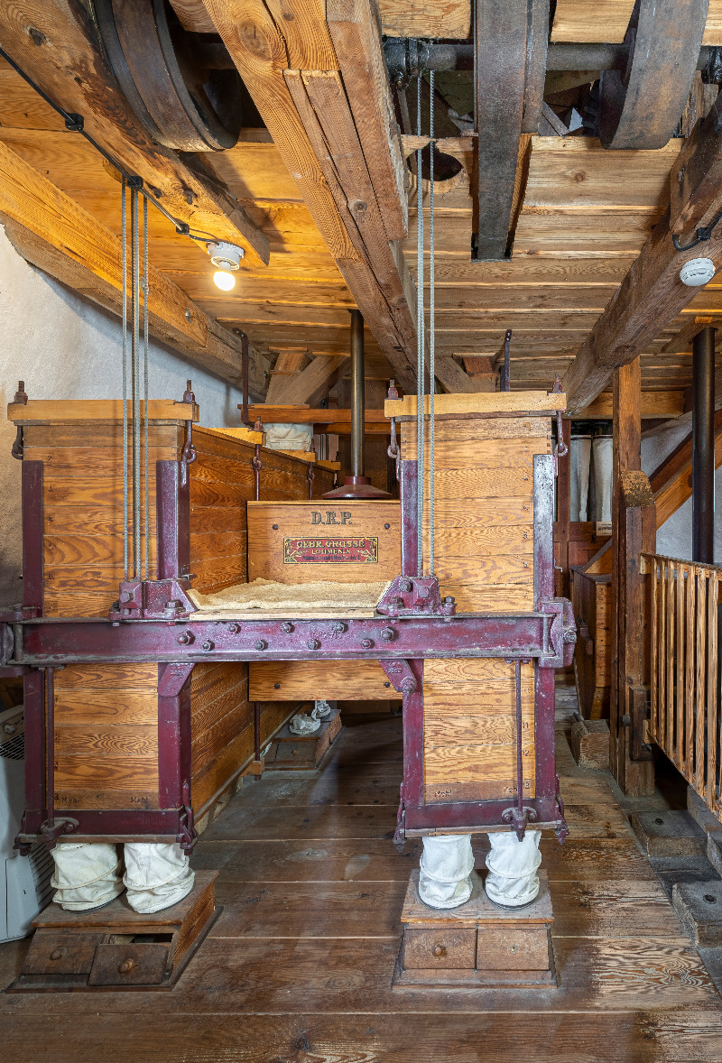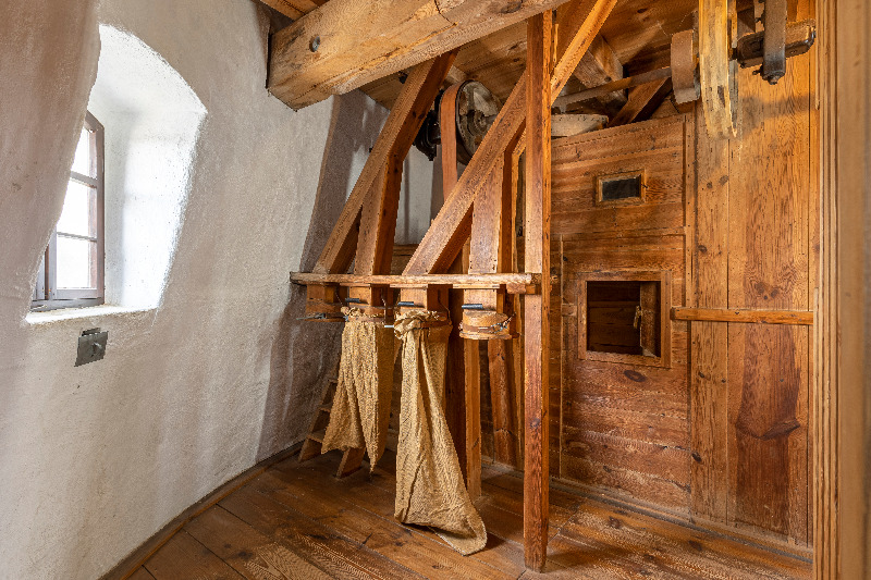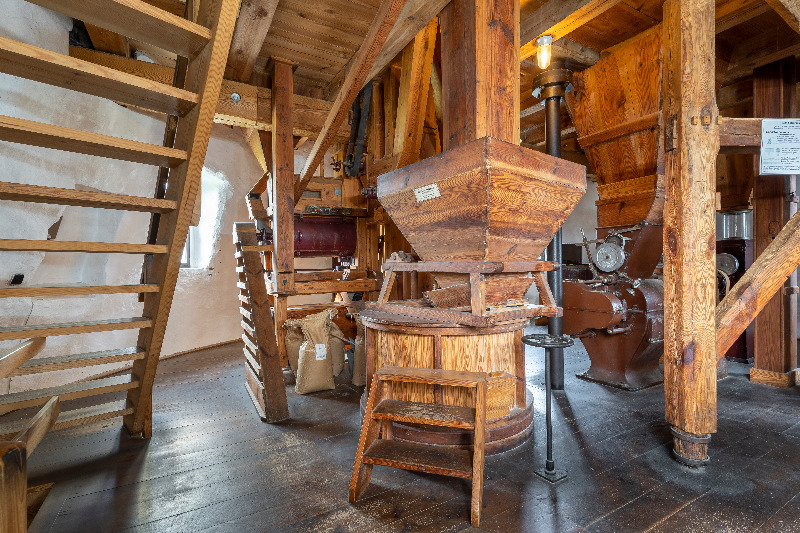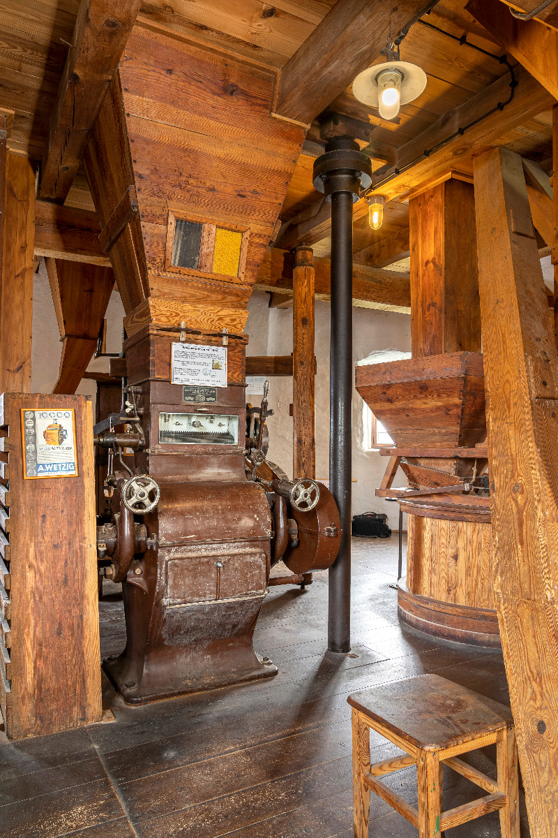 Im Mühlenturm ist die Kornmühle untergebracht. Die vollständig erhaltene Technik entspricht einer typischen Handwerksmühle von etwa 1930. Sie ist voll funktionstüchtig und konnte früher pro Tag ca. 1,5 Tonnen Getreide zu Mehl verarbeiten. Mit dem historischen Steinmahlgang wurde aus allen Getreidesorten Futterschrot hergestellt. Seit Mitte der 1960er Jahre ist die Kornmühle nicht mehr in Betrieb.