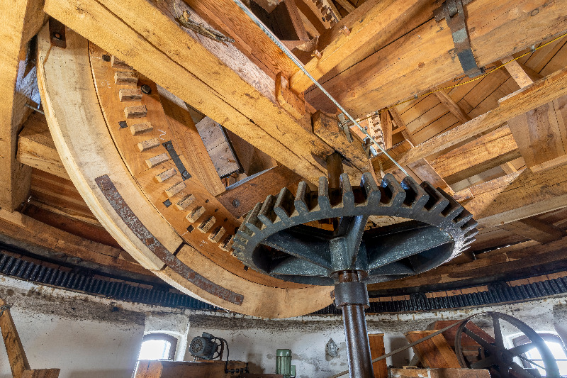 In der frei drehbaren, 25 Tonnen schweren, Turmhaube kann man die mächtige Flügelwelle und ein 3,20 m großes Kammrad, zur Übertragung der Windkraft, bestaunen. Beides ist aus einheimischen Hölzern gezimmert. Sollte ausreichend Wind vorhanden sein, drehen sich die Flügel. Ab Windstärke 4 ist es möglich 3 Maschinen in der Ölmühle und ab Windstärke 6 das Vollgatter in der Sägemühle mit der Windkraft zu betreiben.